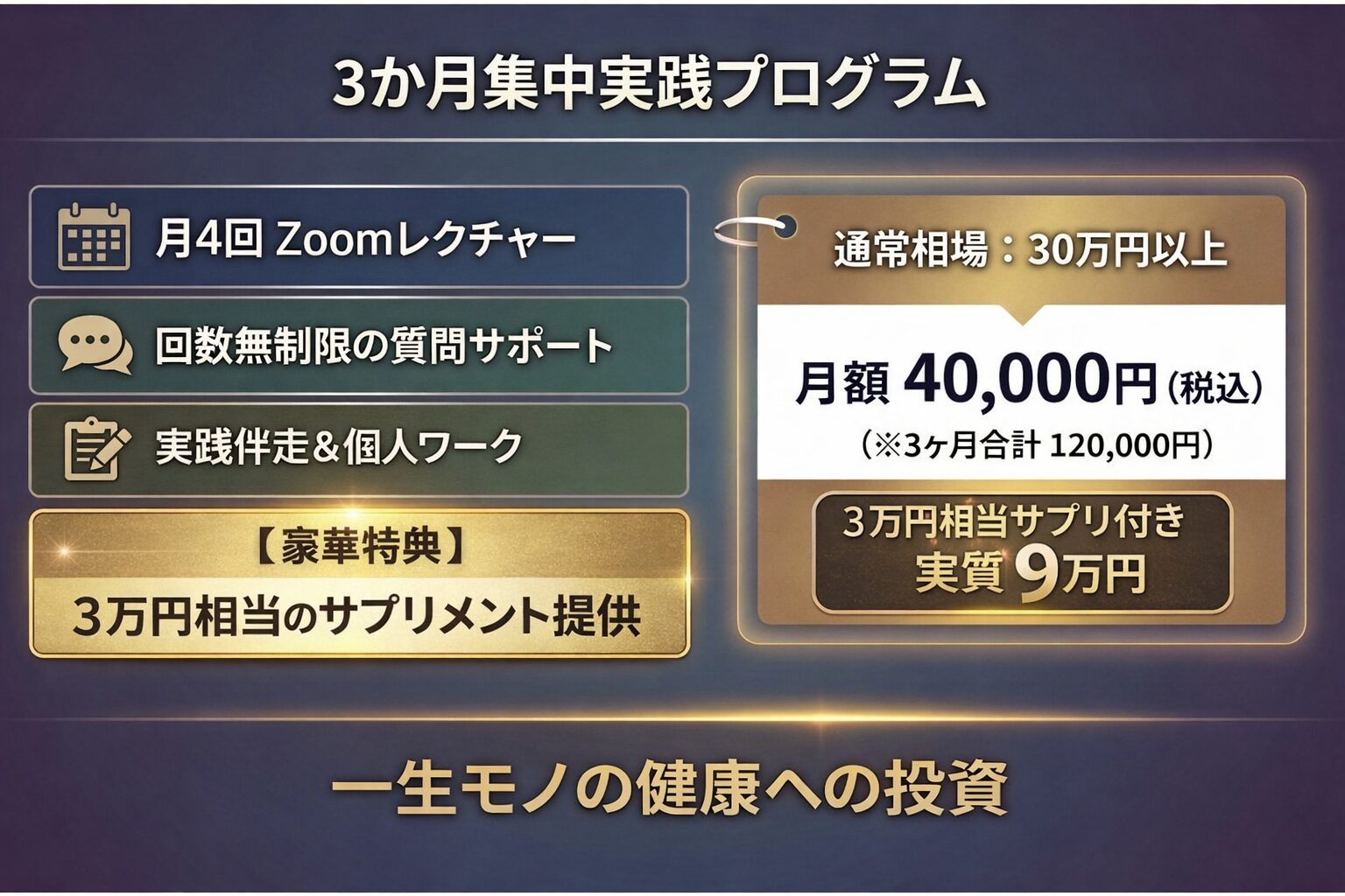 3万円相当のサプリメントが含まれているため、実質9万円でこのプログラムを受けることができます